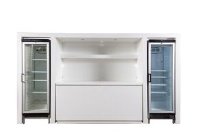 Hochwertiges Designregal als Barrückwand mit LED Spots für Gläser und Sprituosen. Mit Anbaurahmen zur Platzierung von Flaschen- kühlschränken.